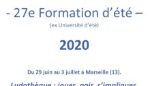 Formation d’été (ex UE) Formation d’été des ludothécaires 2020 « Jouer, agir, s’impliquer » Du lundi 29 juin au vendredi 3 juillet 2020 à MARSEILLE (13). Lors de cette Formation d’été (nouvelle appellation de “l’Université d’été”), nous aborderons la question de la mise en mouvement du joueur, de ses attitudes et engagements. Nous chercherons à identifier les diverses…