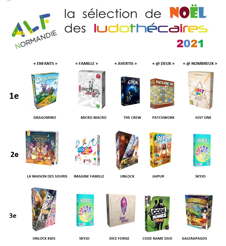 Voici la sélection des ludothécaires de Normandie pour cette année 2021. Merci à la trentaine de collègues qui ont sélectionné puis voté pour proposer une belle sélection de 15 jeux selon les 5 catégories définies. Comme toujours ça reste très subjectif ce genre de classement mais ça donne de bonnes idées d’achat sans trop se tromper pour les fêtes de fin d’année… ![]()