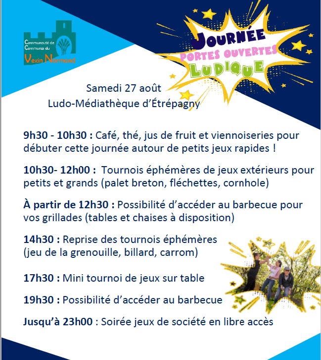 Journée Porte Ouverte Ludique à Etrépagny annel27 / 25 août 2022 De 9h30 à 23h, les jeux extérieurs seront en libre accès pour petits et grands.Et en exclusivité, venez découvrir le jeu Gesoritum tempus, un jeu 100% Gisors. Partager : Partager sur X(ouvre dans une nouvelle fenêtre) X Partager sur Facebook(ouvre dans une nouvelle fenêtre) Facebook J’aime chargement…