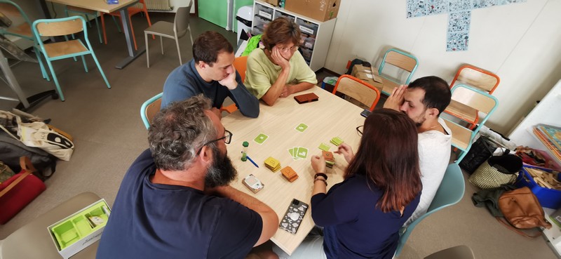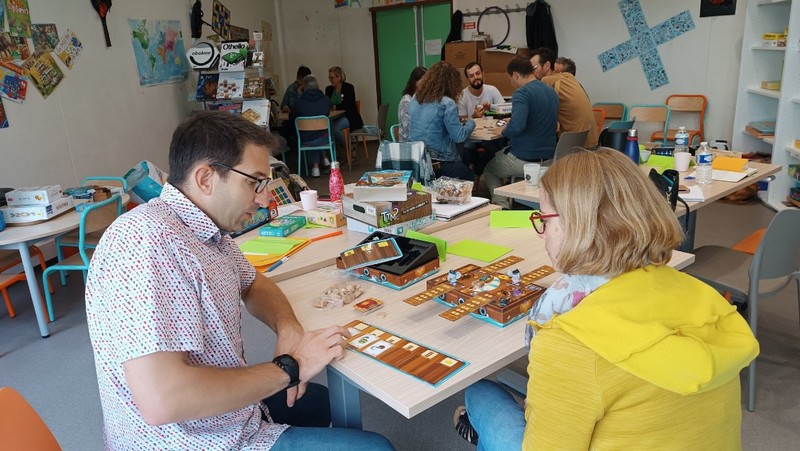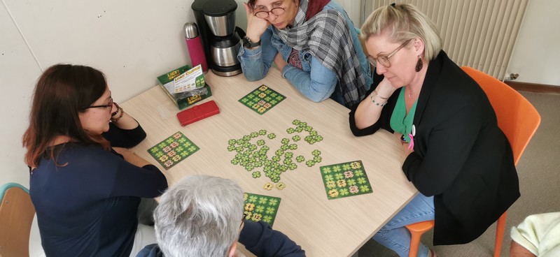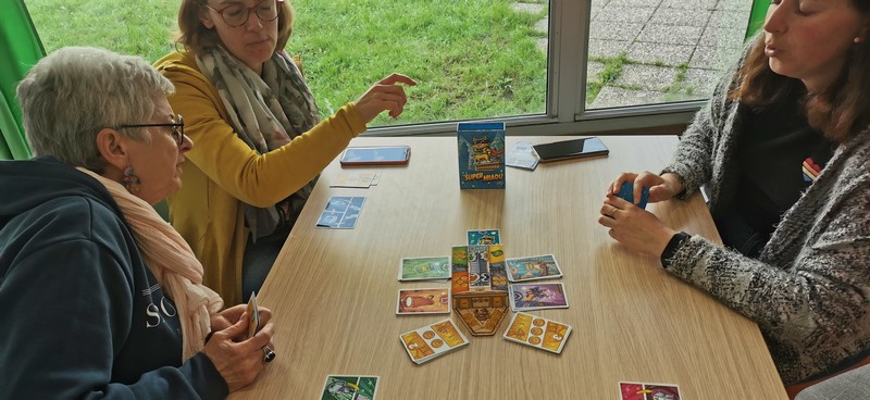 Des jeux de sociétés comme : Color Brain ou TTMC en équipe afin de ne pas mettre en difficulté les personnes (culture), Rondo pour ceux qui l’ont ;-), Just One (attention à la crainte de l’écriture : capacité ou crainte), la planche des Pirates (sans infantilisé le public, ça reste simple et fun) et enfin Sky-jo et Lucky number (le coté loto avec un peu de contrôle)