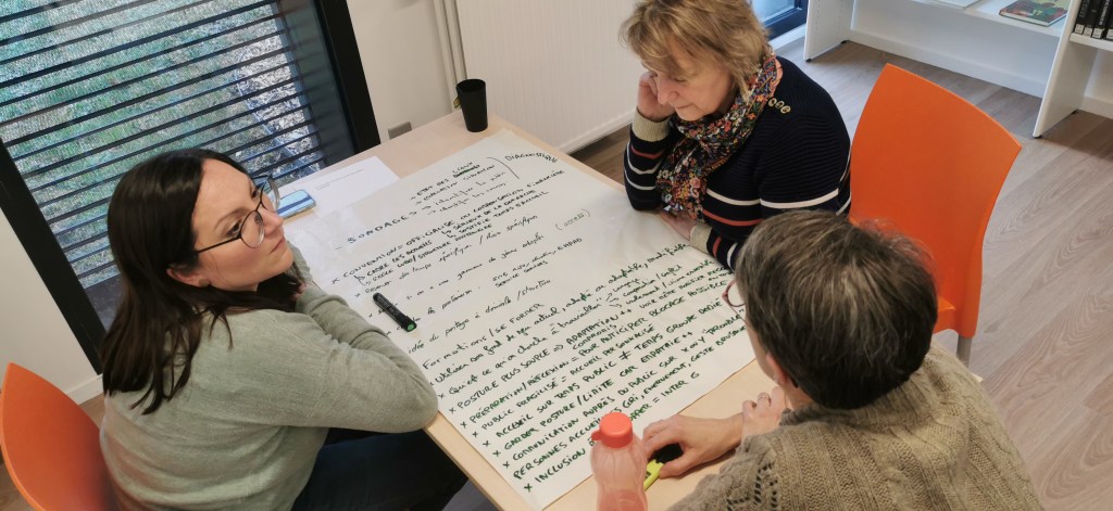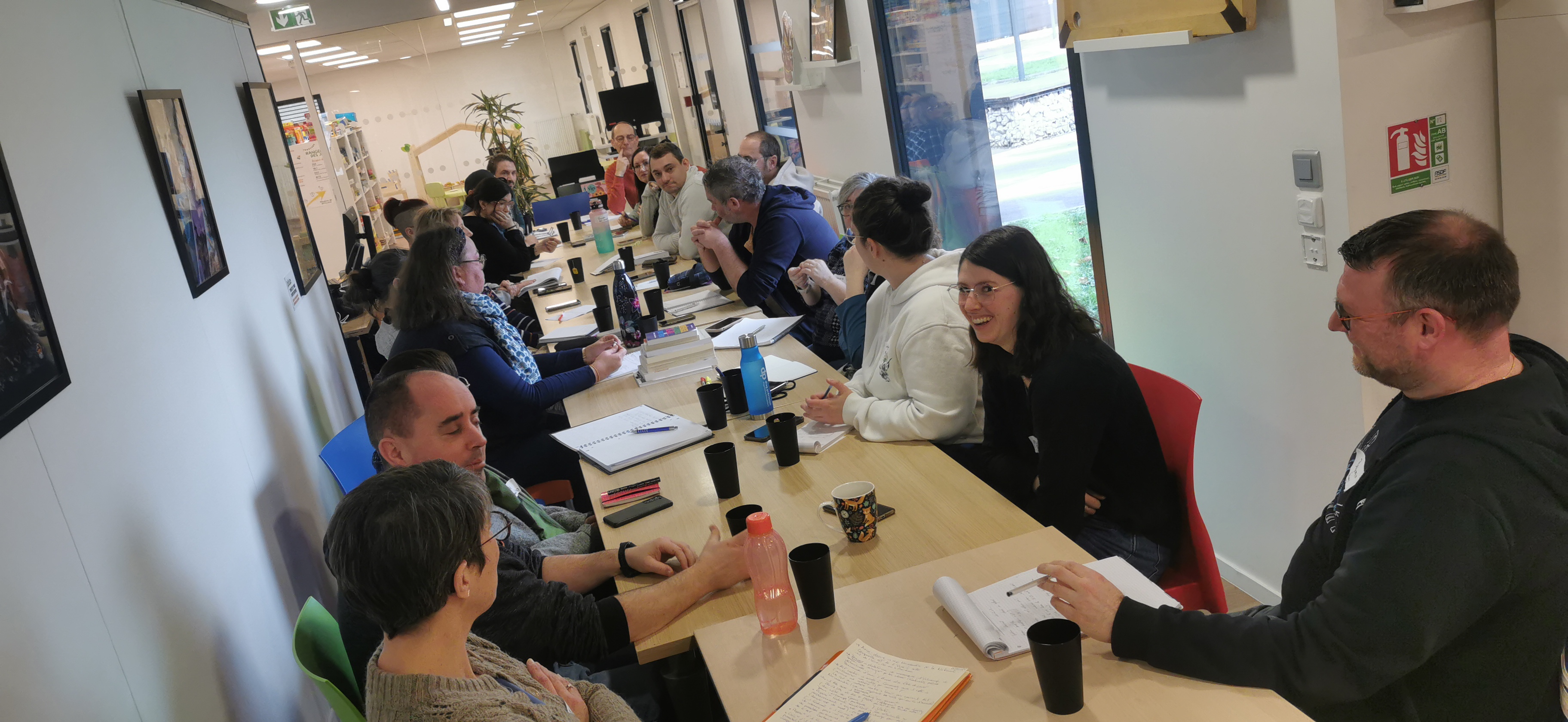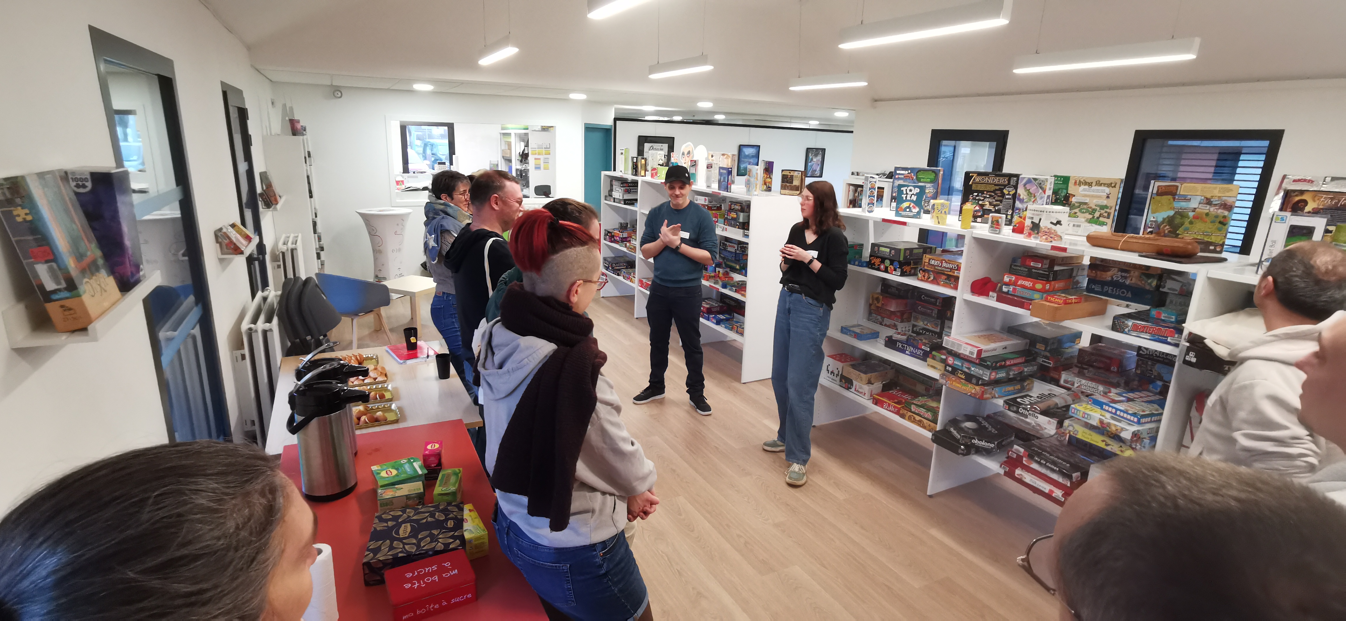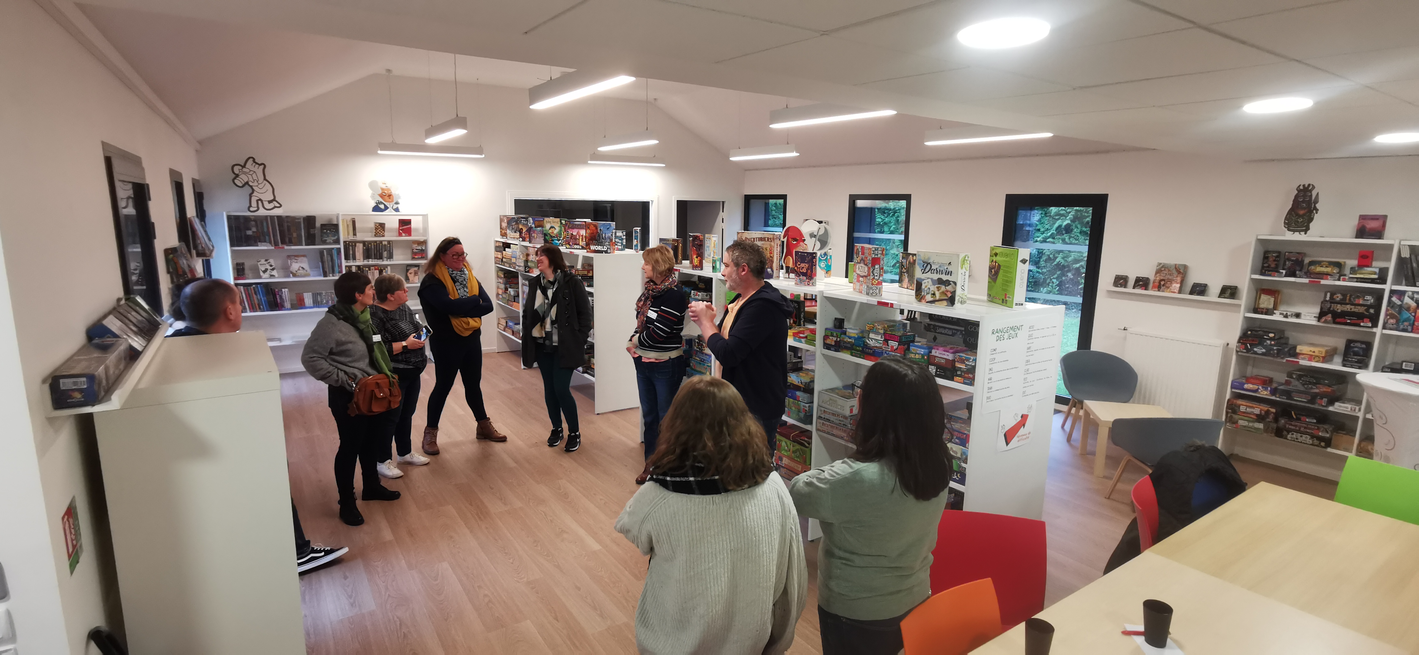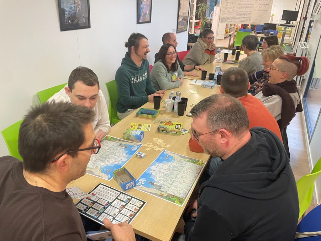 Réunion 27-76 à la nouvelle ludothèque de St Étienne du Rouvray, 21 ludothecaires de 15 ludothèques se retrouvent pour la visite, l’actualité régionale et nationale, échanges de pratiques et un travail sur 6 thématiques sur un mode world café.