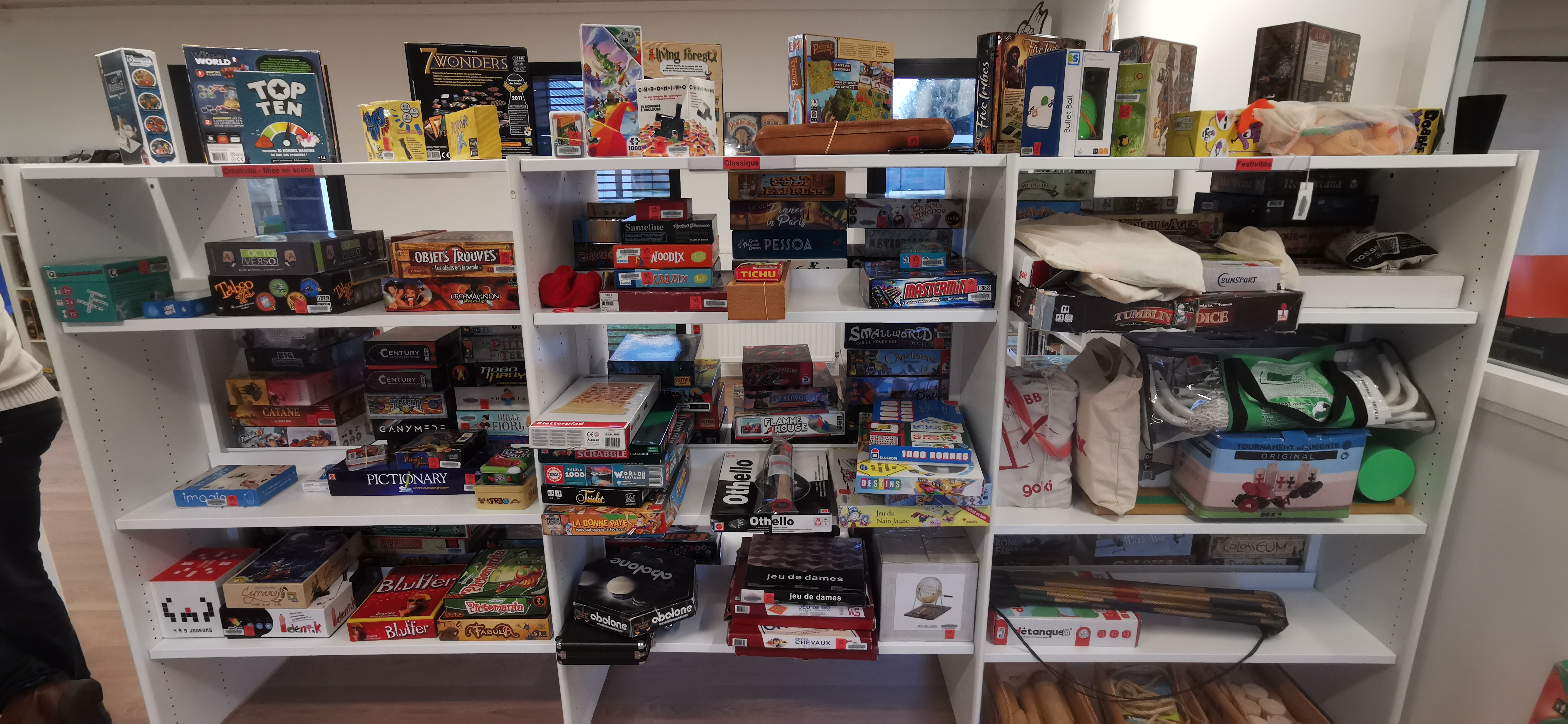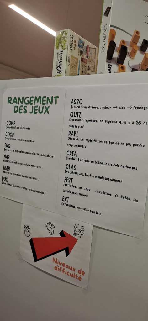 Après une courte (et oui 15 différentes !) présentation et description du classement/rangement des jeux dans les 15 ludothèques (âge, thème, ESAR, mot clé, zone, couleur, image….) où l’on s’aperçoit que chaque structure en fonction de son public et perception propose pleins de possibilités de classements / rangements pour « parler » au public.