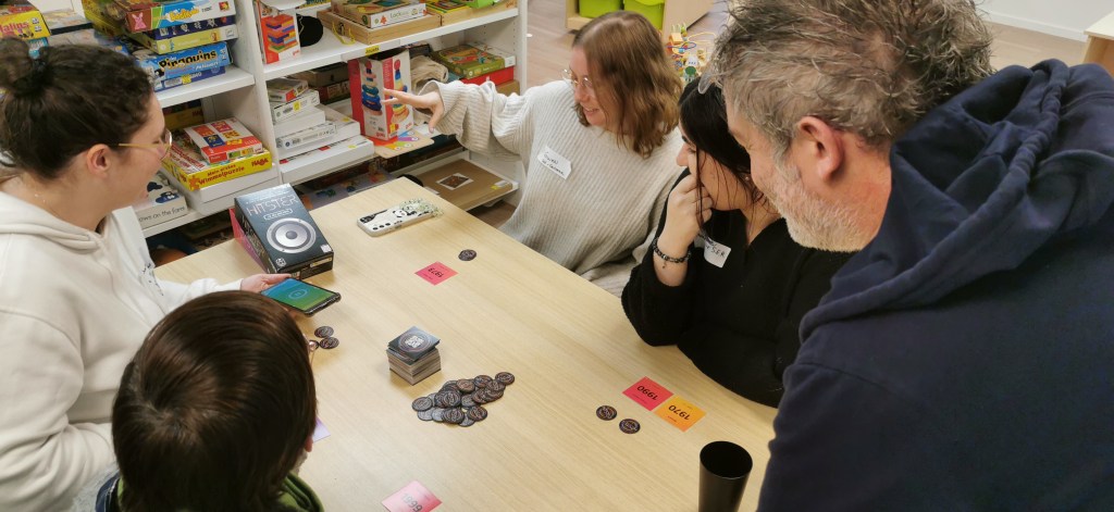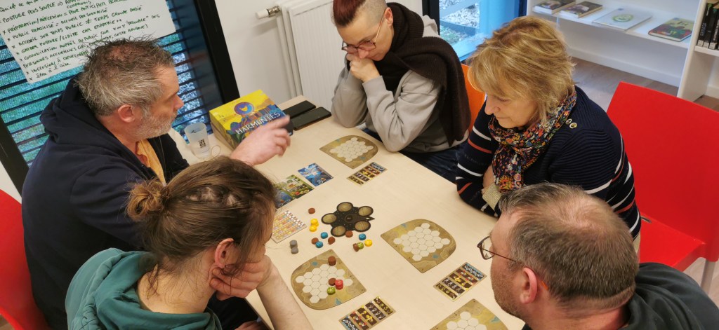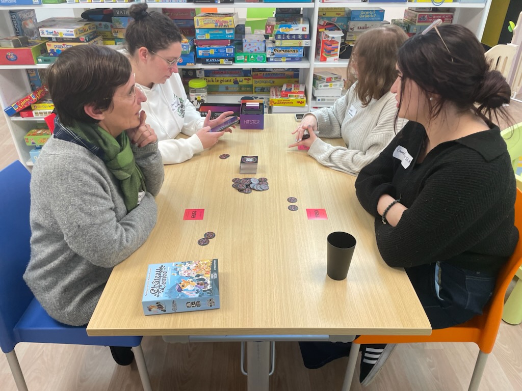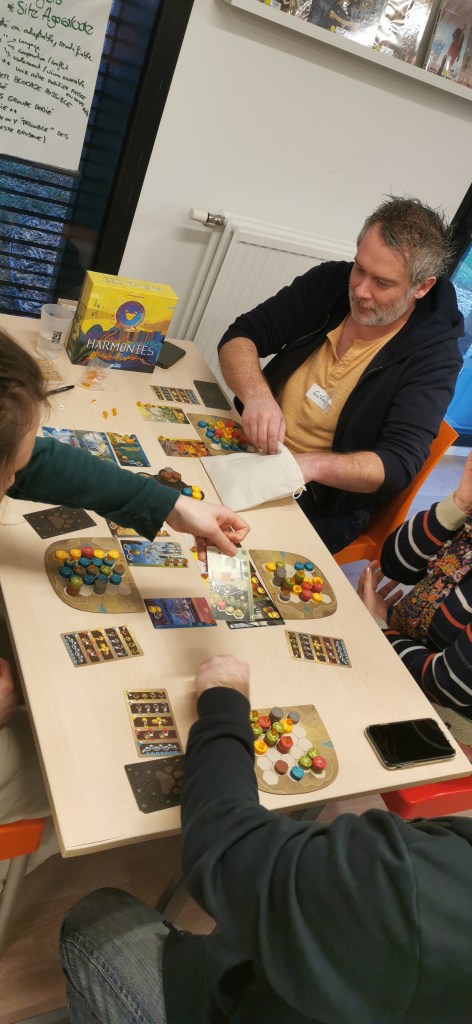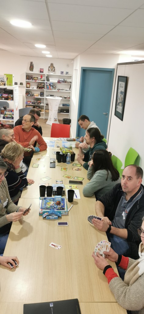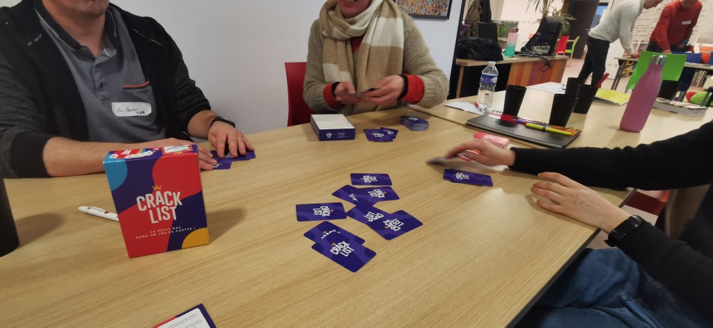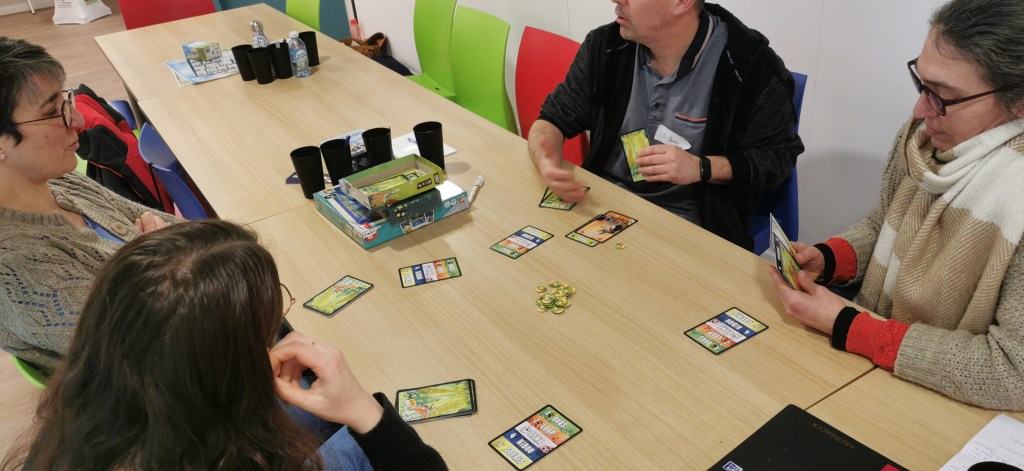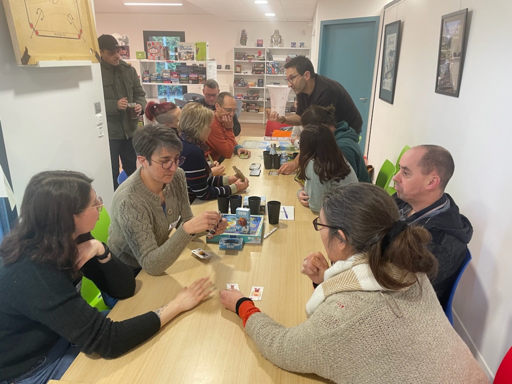 On termine la journée par un temps de jeu, sans doute trop court, car la journée à été dense. Important de se faire découvrir les coups de coeur, surtout pour les collègues isolés dans leur structures. Au programme : Château Combo, Solstis, Prey Another Day, Harmonies, Maudit Mot Dit, Hitster, Monstrolicius, CrackList, Odin, Darts Pitch Game.
