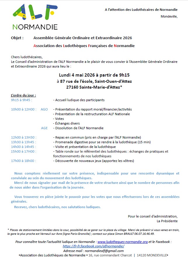 AGO et AGE de l’ALF Normandie : lundi 4 mai ThomasL76 / Il y a 1 jour 9 avril 2026 Oyé Oyé, notre assemblée générale se déroulera le lundi 4 mai à St Ouen d’Attez, surveillez vos boîtes mail, on compte sur votre présence ! convocation AGO et AGE 2026Télécharger Partager : Partager sur X(ouvre dans une nouvelle fenêtre) X Partager sur Facebook(ouvre dans une nouvelle fenêtre) Facebook J’aime chargement…