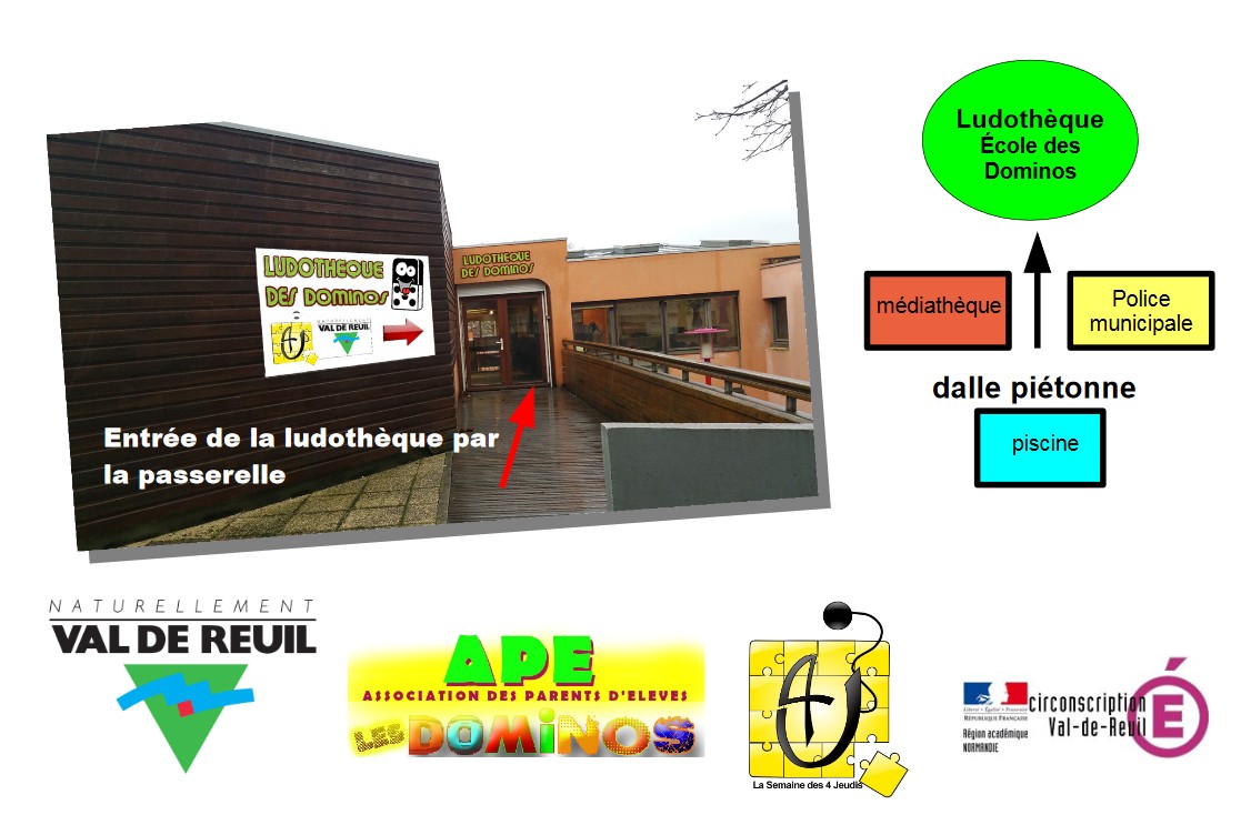 | Ludothèque de Val de Reuil Horaires périodes scolaires : Mardi et Jeudi : 16h30/18h30 Mercredi et samedi : 14h/18h30 Jeudi : 9h/11h30 (petite enfance) Groupes sur RDV Horaires période vacances scolaires : Du mardi au samedi : 14h/18h30 Jeudi : 9h/11h30 (petite enfance) Ateliers parent/enfant (nous consulter) LudoClub (nous consulter) Groupes sur RDV | ![]() |
